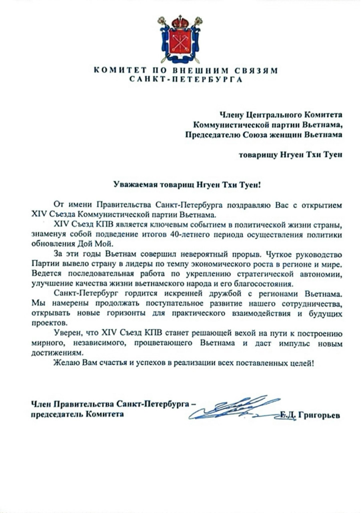 Thay mặt Chính quyền thành phố Xanh Pê-téc-bua, tôi xin gửi tới đồng chí lời chúc mừng nồng nhiệt nhân dịp khai mạc Đại hội Đảng Cộng sản Việt Nam lần thứ 14.