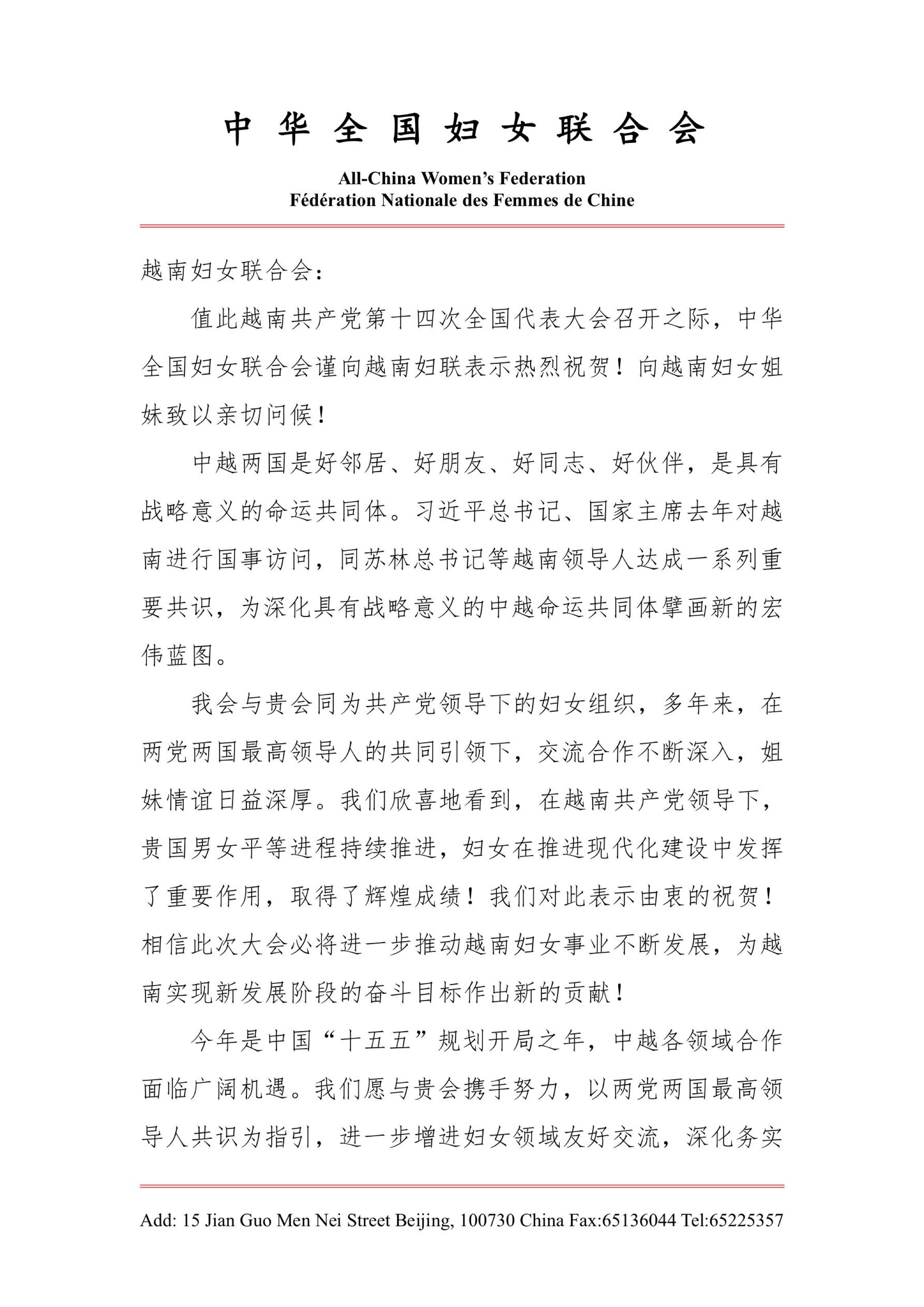 Nhân dịp Đại hội đại biểu toàn quốc lần thứ XIV của Đảng Cộng sản Việt Nam, Hội Liên hiệp Phụ nữ Toàn quốc Trung Hoa trân trọng gửi tới Hội Liên hiệp Phụ nữ Việt Nam lời chúc mừng nồng nhiệt nhất, đồng thời gửi tới các chị em phụ nữ Việt Nam lời thăm hỏi thân thiết.