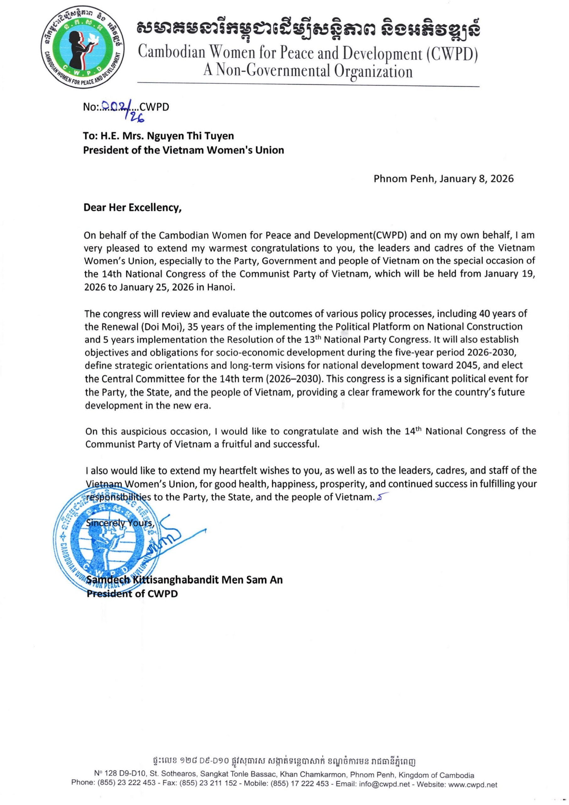 Thưa bà, Thay mặt Hội Phụ nữ Campuchia vì Hòa bình và Phát triển (CWPD), đồng thời với tư cách cá nhân, tôi rất vinh dự và vui mừng gửi tới Bà, cùng toàn thể lãnh đạo và cán bộ Hội Liên hiệp Phụ nữ Việt Nam, đặc biệt là tới Đảng, Chính phủ và Nhân dân Việt Nam, lời chúc mừng nồng nhiệt nhất nhân dịp Đại hội đại biểu toàn quốc lần thứ XIV của Đảng Cộng sản Việt Nam, dự kiến được tổ chức từ ngày 19 đến ngày 25 tháng 01 năm 2026 tại Hà Nội.