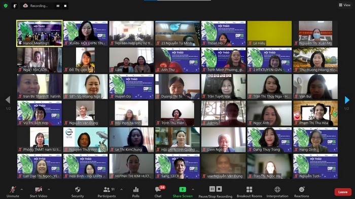 Hội thảo “Phụ nữ Việt Nam tham gia hành động ứng phó biến đổi khí hậu và giảm thiểu rủi ro thiên tai” do Hội LHPN Việt Nam, Trung tâm Nghiên cứu Môi trường và Cộng đồng (CECR) với sự hợp tác của Mạng lưới các tổ chức phi chính phủ Việt Nam về Biến đổi Khí hậu (VNGO-CC) tổ chức theo hình thức trực tuyến đã diễn ra tại Hà Nội, sáng 09/11.