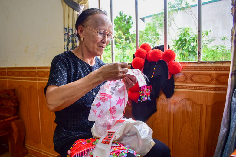 Bà Thạch tỉ mẩn thêu họa tiết mẫu trao truyền cho thế hệ sau Chiều muộn, những sợi nắng vàng rơi trên cửa sổ, bà Lý Thị Thạch - người phụ nữ Dao Quế Lâm, 66 tuổi - vẫn nhịp nhàng, tỉ mẩn đưa từng mũi kim, thêu nên những họa tiết sinh động trên bộ váy truyền thống đậm sắc của người Dao đỏ. Bà Thạch là một trong số ít những phụ nữ Dao lớn tuổi ở Thôn 10 (xã Tân Thanh) vẫn còn cần mẫn gìn giữ nét văn hóa truyền thống này.