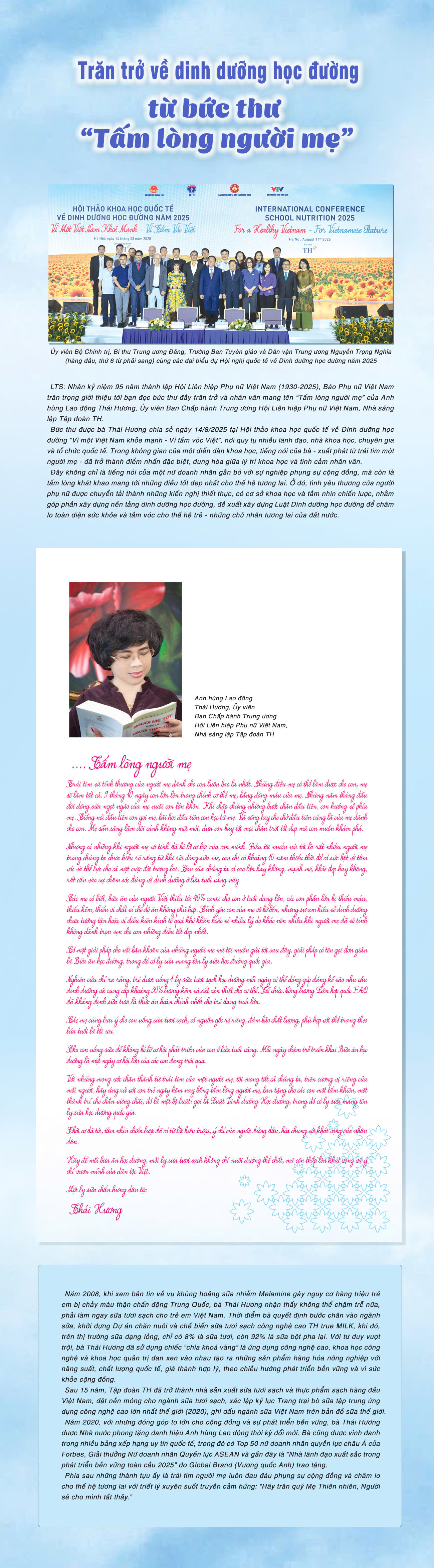 Nhân kỷ niệm 95 năm thành lập Hội Liên hiệp Phụ nữ Việt Nam (1930-2025), Báo PNVN trân trọng giới thiệu tới bạn đọc bức thư đầy trăn trở và nhân văn mang tên “Tấm lòng người mẹ” của Anh hùng Lao động Thái Hương, Ủy viên Ban Chấp hành Trung ương Hội Liên hiệp Phụ nữ Việt Nam, Nhà sáng lập Tập đoàn TH.
