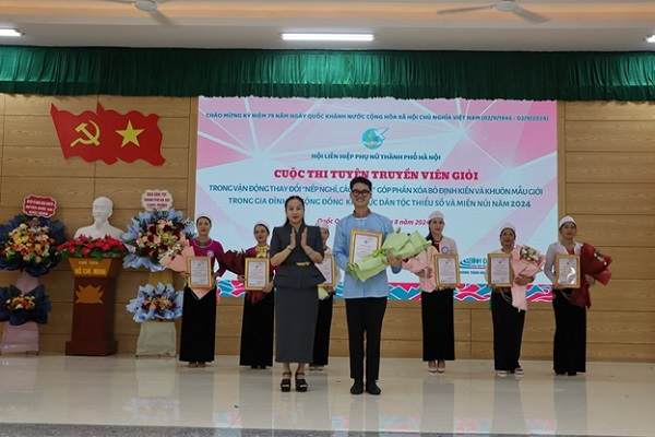 Ông Nguyễn Phúc Hải, Phó trưởng ban Dân tộc TP Hà Nội; bà Phạm Thị Mỹ Hoa, Phó Chủ tịch Hội LHPN Hà Nội trao cờ và hoa chúc mừng các đội tham gia cuộc thi sáng 29/8.