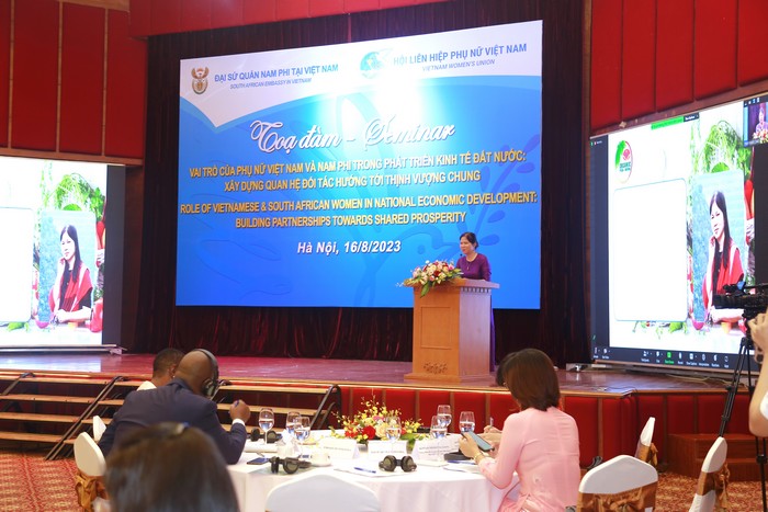 Phát biểu khai mạc Tọa đàm, Phó Chủ tịch Hội LHPN Việt Nam Trần Lan Phương chia sẻ: “Phụ nữ Việt Nam, Nam Phi đều có vai trò to lớn trong cuộc đấu tranh giải phóng dân tộc cũng như trong tiến trình xây dựng và phát triển đất nước, trong đó có lĩnh vực kinh tế. Phụ nữ Nam Phi tham gia đông đảo trong lực lượng lao động với hơn 51% tổng số phụ nữ từ 15 tuổi trở lên (4/2023); tỷ lệ doanh nghiệp do nữ làm chủ chiếm hơn 21% (2022); doanh nghiệp vừa và nhỏ do nữ làm chủ chiếm 47%. Phụ nữ Việt Nam chiếm 49% tổng số lao động cả nước; tỷ lệ nữ giám đốc, chủ doanh nghiệp, hợp tác xã đạt hơn 28%; nguồn lao động nữ đảm nhận các vị trí chuyên môn kỹ thuật bậc cao và bậc trung chiếm tỷ lệ cao”.