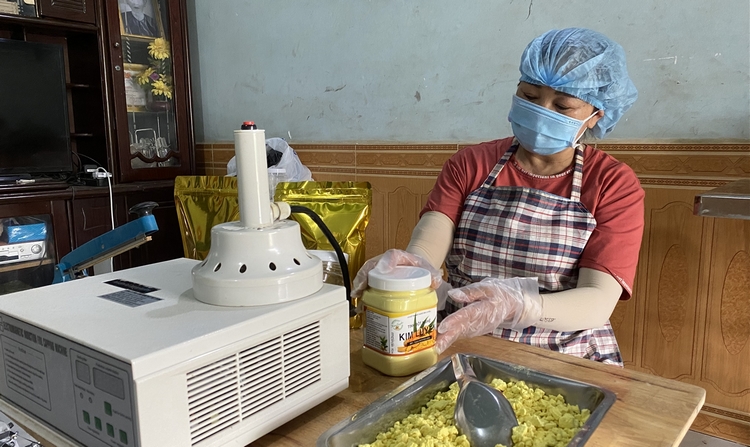 Chị Trần Thị Kim Luyến đang đóng gói các sản phẩm tinh bột nghệ