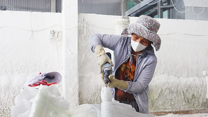 Chị Bình chạm khắc tượng.