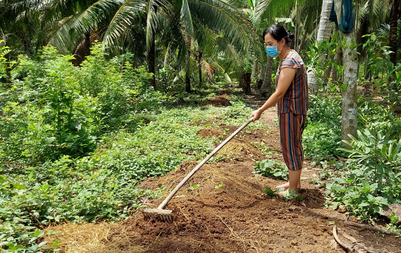 Phụ nữ nông thôn ủ phân hữu cơ trồng rau rạch sử dụng trong hộ gia đình.