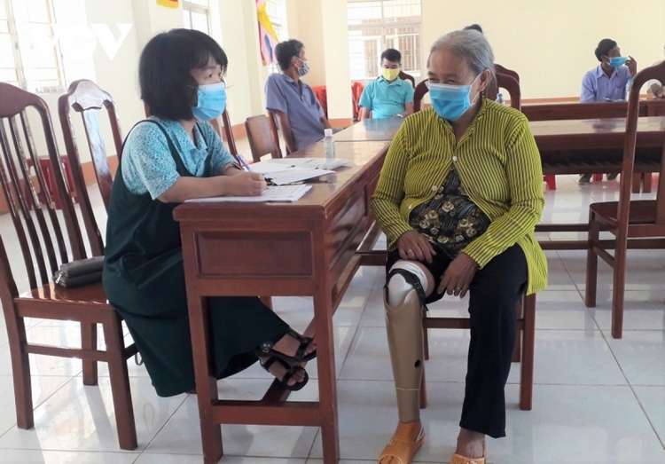 Chị Phan Bích Ngân đang hỗ trợ giúp đỡ dụng cụ chỉnh hình cho người khuyết tật.