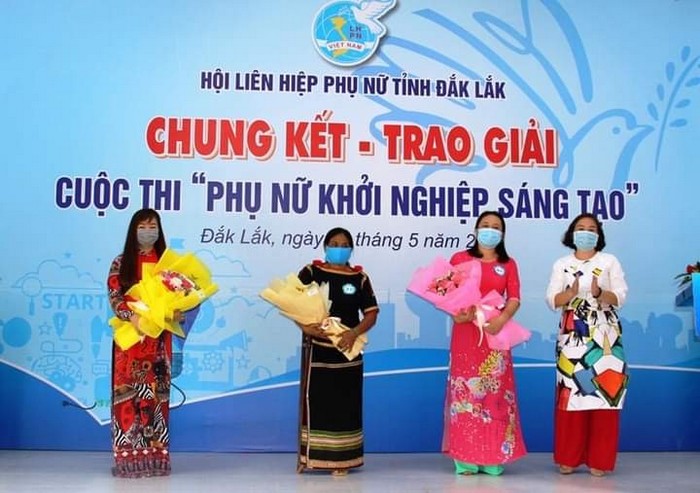 Dự án của chị H’Yar Kbuôr (thứ hai trái ảnh qua) đã đạt giải trong cuộc thi Phụ nữ khởi nghiệp, sáng tạo do Hội LHPN tỉnh Đắk Lắk tổ chức và được các nhà đầu tư lựa chọn đề hỗ trợ