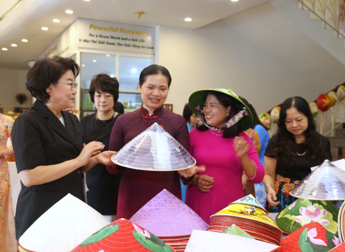 Chủ tịch Hội LHPN Việt Nam Hà Thị Nga (Áo dài tím) và Chủ tịch Mạng lưới Nữ đại biểu Quốc hội Hàn Quốc Lee Hye Hoon (trái ảnh) tham quan gian hàng trưng bày sản phẩm xanh của chị em phụ nữ