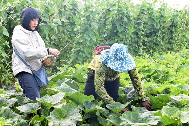 Hoàng Ly hướng dẫn nhân viên thu hoạch bí ngô tại trang trại