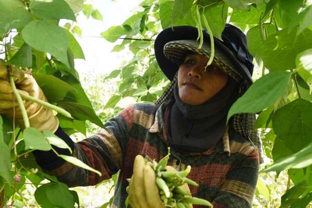 Nhân viên thu hoạch đậu ve trồng theo phương pháp hữu cơ