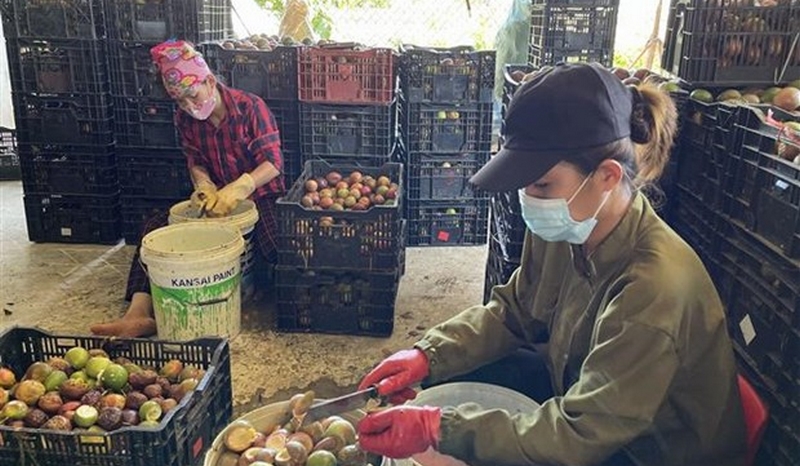 Sơ chế chanh leo trước khi chuyển tới doanh nghiệp thu mua.