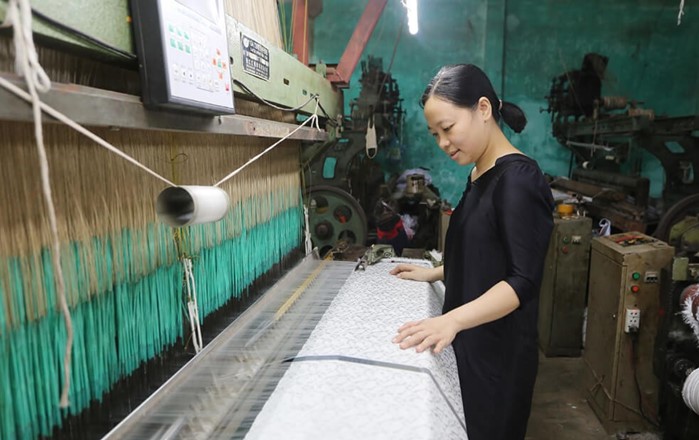 Chị Trần Thị Yến bên những tấm vải đang dệt