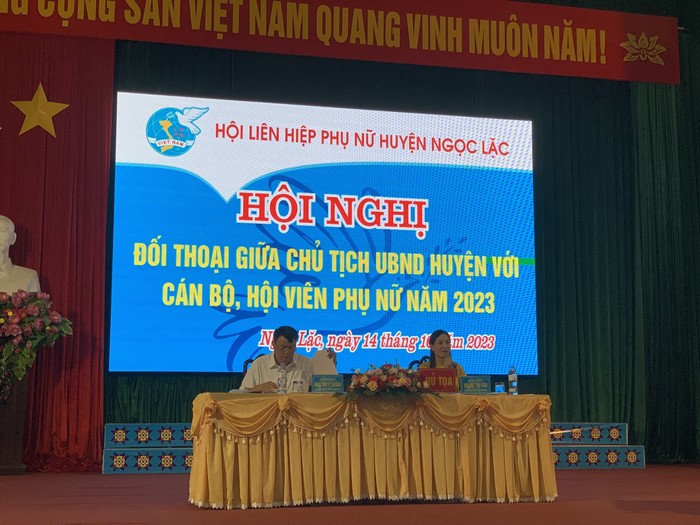 Hội LHPN huyện Ngọc Lặc tổ chức hội nghị đối thoại giữa Hội nghị đối thoại giữa Chủ tịch UBND huyện với cán bộ, hội viên, phụ nữ năm 2023. Qua hội nghị, cán bộ, hội viên, phụ nữ đã kiến nghị cấp có thẩm quyền, xem xét quan tâm đến công tác quy hoạch, đào tạo, bồi dưỡng, sắp xếp, bố trí cán bộ nữ, có cơ chế chính sách hỗ trợ, đặc biệt là cán bộ nữ ở cơ sở xã, thị trấn khi tham gia các lớp đào tạo, bồi dưỡng, nâng cao trình độ chuyên môn, nghiệp vụ, lý luận chính trị đáp ứng yêu cầu trong tình hình mới; có giải pháp tháo gỡ, động viên người hoạt động không chuyên trách để họ yên tâm công tác tại các thôn, bản, tiểu khu; chính sách hỗ trợ cho các doanh nghiệp mới thành lập theo đề án phát triển doành nghiệp huyện Ngọc Lặc giai đoạn 2017 – 2025...