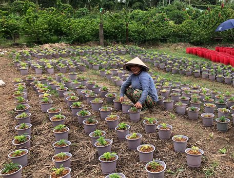 Kết hợp trồng hoa tết trong vườn cây ăn trái của gia đình, mỗi mùa tết qua đi, chị Nguyễn Thị Thủy (ấp Tân Vĩnh- xã Trường An) càng thêm phấn khởi với thu nhập mang lại từ những chậu hoa. Chị Thủy chia sẻ: “Hồi xưa, tôi dệt chiếu kiếm sống rồi thấy cô hàng xóm trồng bông nên qua coi học hỏi trồng theo. Trồng đợt bông đầu tiên thấy có lời, vậy là vợ chồng tôi mạnh dạn mở rộng, vừa trồng vừa học hỏi rút kinh nghiệm qua từng năm”. Năm nay, chị Thủy trồng 3.000 chậu hoa các loại như hoa vạn thọ, mào gà, cúc Đài Loan,…