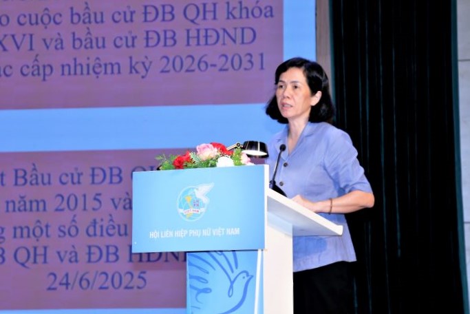 Phó Chủ tịch Hội LHPN Việt Nam Nguyễn Thị Minh Hương trình bày chuyên đề "Nhiệm vụ của Hội LHPN các cấp trong công tác bầu cử Đại biểu Quốc hội và Hội đồng Nhân dân" Thực hiện các Chỉ thị, Nghị quyết của Đảng, pháp luật của Nhà nước về công tác bầu cử, Hội LHPN Việt Nam các cấp đã và đang chủ động triển khai nhiều hoạt động nhằm phát huy vai trò, trách nhiệm, đồng thời bảo đảm quyền tham gia chính trị của phụ nữ trong bầu cử Đại biểu Quốc hội khóa XVI và Đại biểu HĐND các cấp nhiệm kỳ 2026 - 2031.