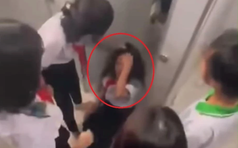 Nữ sinh lớp 8, Trường THCS An Điền, TPHCM, bị đánh đập trong khu vực nhà vệ sinh của trường. Ảnh cắt từ clip