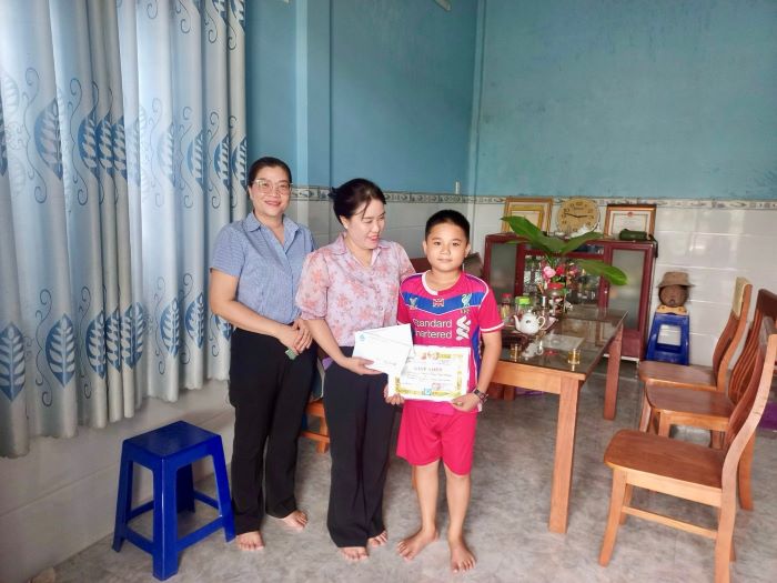 Phó Chủ tịch Hội LHPN tỉnh Hoàng Thị Thanh Nhã đã đến thăm, trao tặng kinh phí hỗ trợ chăm sóc nuôi dưỡng trẻ nhận đỡ đầu và món quà nhân Ngày Quốc tế thiếu nhi (1.6) cho cháu Dương Trần Huy Hoàng - sinh năm 2014, ở xã Phước Quang, huyện Tuy Phước
