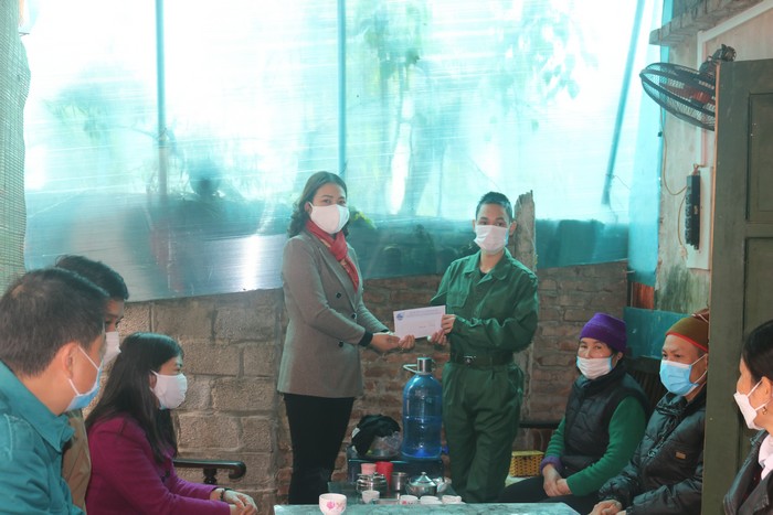 Phó Chủ tịch Thường trực Hội LHPN tỉnh Đinh Thị Hương tặng quà tân binh có hoàn cảnh khó khăn ở xã Đại Tập, huyện Khoái Châu