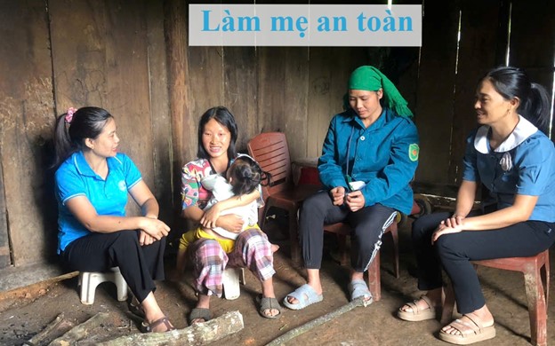 Cán bộ phụ nữ xã cùng y tế thôn bản đến thăm hỏi, tuyên truyền cho chị em về chăm sóc dinh dưỡng thai kỳ