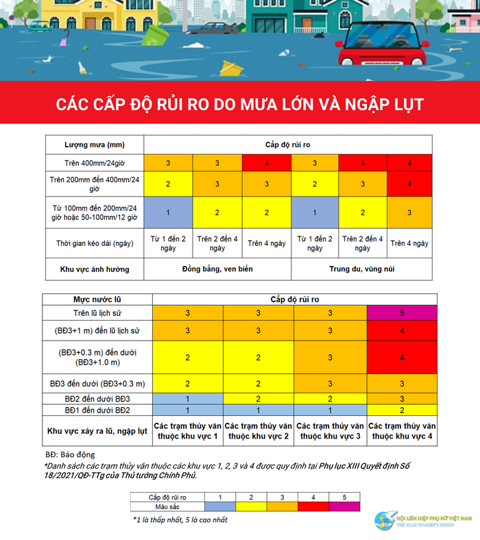 Theo Phụ lục XII – Bảng 4 và 5 Quyết định 18/2021/QĐ-TTG, quy định về dự báo, cảnh báo, truyền tin thiên tai và cấp độ rủi ro thiên tai của Thủ tướng Chính phủ, cấp độ rủi ro do mưa lớn và cấp độ rủi ro do lũ, ngập lụt như sau
