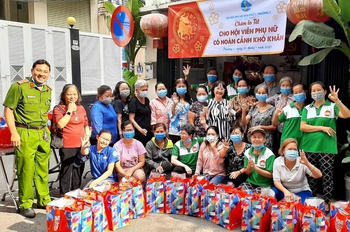 Dì Dung (áo kẻ) trao tặng quà Tết cho phụ nữ khó khăn