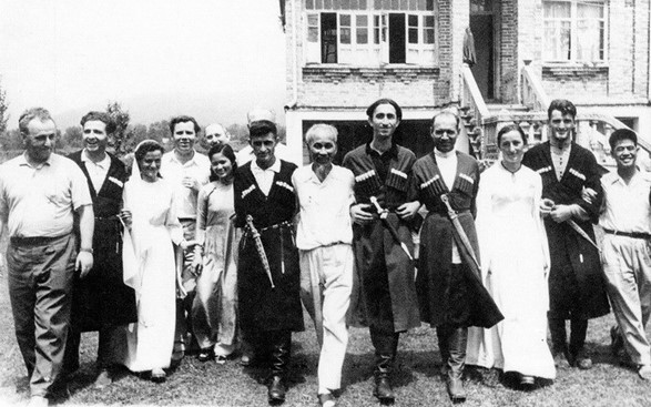 Chủ tịch Hồ Chí Minh hòa nhịp cùng thanh niên Kazakhstan trong vũ điệu dân tộc, tháng 7/1959. Ảnh tư liệu