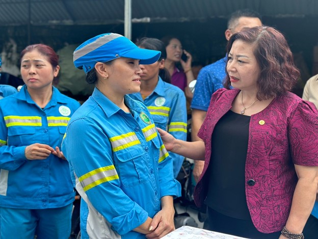 Bà Lê Thị Thiên Hương, Phó Chủ tịch Hội LHPN Hà Nội động viên các nữ công nhân môi trường đang làm nhiệm vụ.