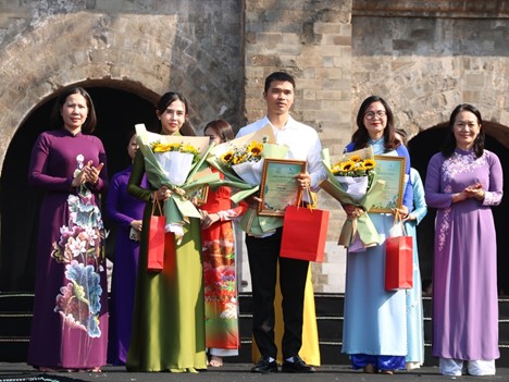 Phó Chủ tịch Hội LHPN Việt Nam Nguyễn Thị Thu Hiền (bìa trái) và Phó Chủ tịch Thường trực HĐND thành phố Hà Nội Phùng Thị Hồng Hà trao giải nhì cho các tác giả