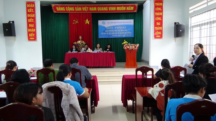 Hội viên phụ nữ đặt câu hỏi tại buổi đối thoại Tham dự có bà Rơ Chăm H’ Hồng - TUV, Chủ tịch Hội LHPN tỉnh; các Phó Chủ tịch Hội LHPN tỉnh; đại diện lãnh đạo UBMTTQVN huyện, các đơn vị phối hợp với huyện Hội và đại diện lãnh đạo Hội LHPN huyện Chư Prông.