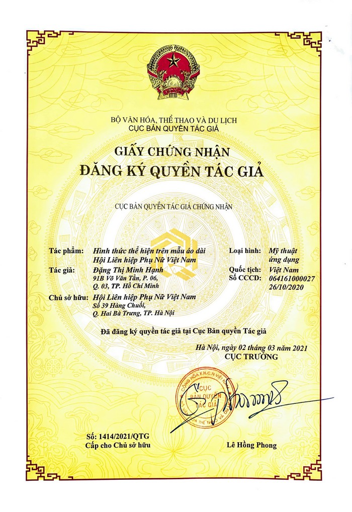 Tác phẩm Hình thức thể hiện trên mẫu Áo dài Hội LHPN Việt Nam do nhà thiết kế Đặng Thị Minh Hạnh thiết kế vừa được Cục Bản quyền tác giả - Bộ Văn hóa, Thể thao và Du lịch cấp chứng nhận bản quyền tác giả.