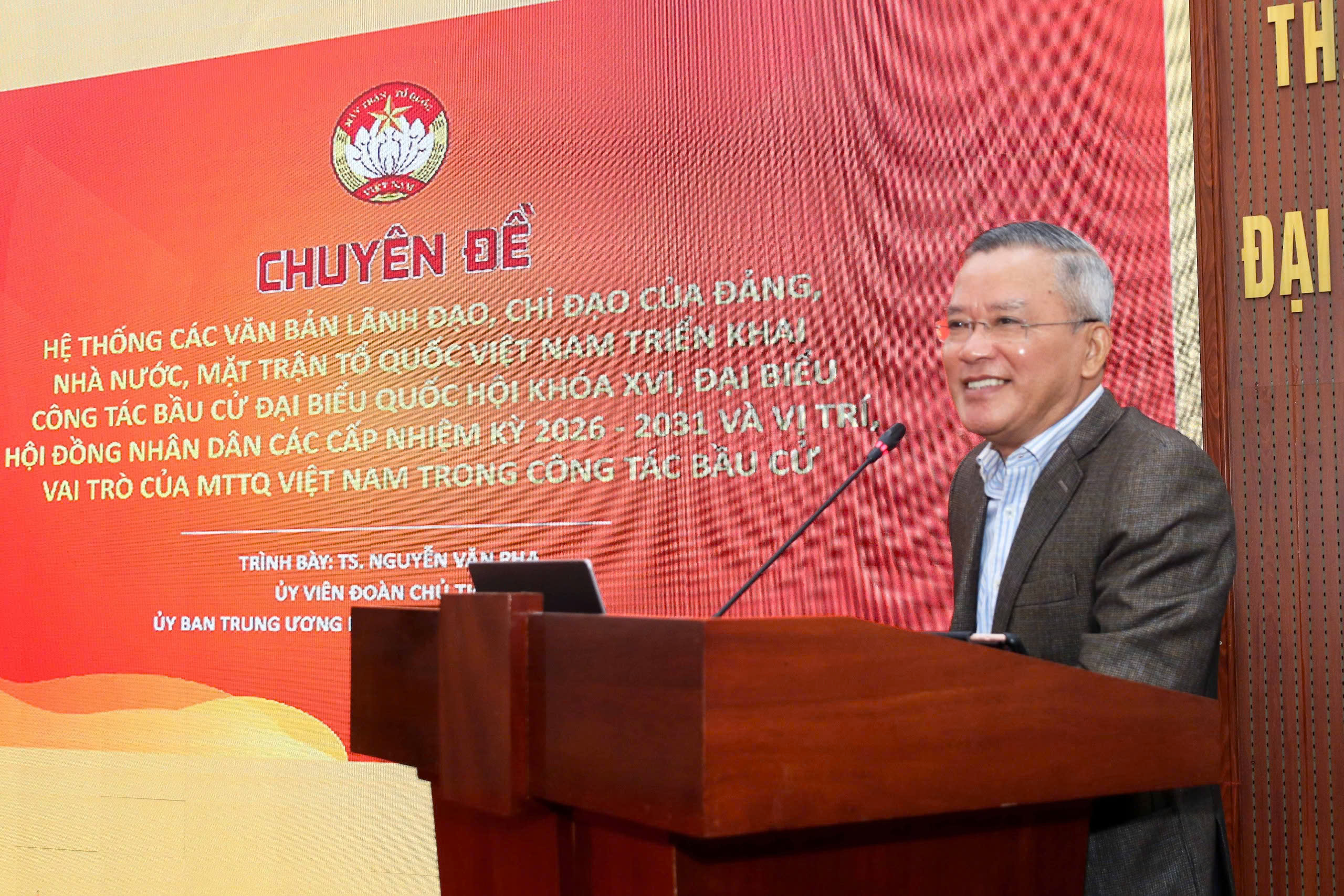 Ông Nguyễn Văn Pha, Ủy viên Đoàn Chủ tịch Ủy ban Trung ương MTTQ Việt Nam, trình bày chuyên đề tại Hội nghị