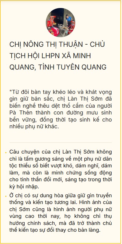 Ở xã Minh Quang (tỉnh Tuyên Quang) có người phụ nữ Pà Thẻn đang nỗ lực góp phần đổi thay bản làng. Bằng đôi tay khéo léo, chị vừa giữ lửa nghề thêu dệt thổ cẩm truyền thống, vừa làm kinh tế giỏi, vừa gắn kết cộng đồng. Đó là chị Làn Thị Sớm, cá nhân điển hình tiên tiến được tuyên dương tại Đại hội Thi đua yêu nước Hội LHPN Việt Nam lần thứ V.
