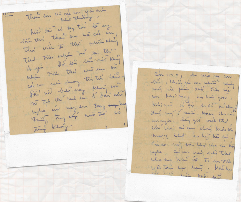 Các con thân yêu, mến thương của ba, ba rất nhớ các con, ba xem ảnh các con luôn, thư của các con gửi cho ba, ba giữ mãi thỉnh thoảng đọc thư con ba lâng lâng trong lòng chan chứa niềm vui. Ba thương các con lắm nhưng biết làm sao mà gửi các thứ ra cho con. Ba nghe tin cô giáo khen các con lắm, mỗi lần Nhân đứng dậy đọc bài ngồi xuống là ai cũng muốn nhìn, ba hình dung các con mà sung sướng. Em Nghĩa bữa nay có khỏe và mập không, em chắc nhớ ba lắm từ nhỏ đến lớn cứ nằm trong lòng ba, đi công tác đâu xa thì đếm từng ngày, bữa cơm có ba ăn thì ngon thêm, thế mà không nhớ sao được. Em Nhã bữa nay đã học được chưa, đã viết được chưa có đi chơi nắng không, có ghẻ không, còn em Vân thì nghe nói cũng ngoan và đẹp gái không kém chị. Em Vân hay quá hè, xa mẹ mà cũng không sao cả lại được ngoan, được ca hát vui vẻ quá hè. Ba hình dung em Vân bữa nay nói năng thành thạo rồi, dạo này mẹ có mua cho các con đôi giày nào chưa… (Trích thư của ông Trần Trọng Hoán gửi cho vợ là bà Phan Thị Miên ngày 30/4/1966)