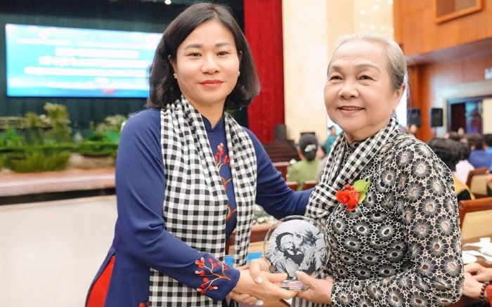 Bà Nguyễn Thị Minh Hương (bên phải) - Phó Chủ tịch Hội LHPN Việt Nam - tặng món quà tri ân có in bức ảnh “Bắc Nam sum họp” đến một nữ cựu tù cách mạng