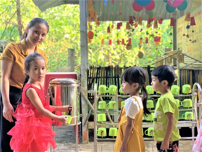 Các em mầm non được sử dụng nước sạch nhờ cô Hiền đã vận động để khoan giếng Tại khuôn viên Trường Mầm non Trà Thanh ở thôn Vuông, xã Trà Thanh, nhiều cây xanh, tiểu cảnh trang trí được cắt tỉa gọn gàng, khá sạch đẹp. Ngoài phòng học còn có thêm các khu chức năng khác như phòng làm việc của giáo viên, khu vui chơi cho trẻ… Có được kết quả đó cũng một phần nhờ cô giáo Hiền không quản ngại đường xa để đến các nơi, vận động các mạnh thường quân “trợ sức” xây trường. “Bằng trách nhiệm của một người công tác trong ngành giáo dục, tôi hiểu rằng, ở nơi mà phần lớn phụ huynh là người Cor, thuộc diện hộ nghèo, đời sống khó khăn thì việc vận động đóng góp từ phụ huynh là điều khó khăn. Sau nhiều đêm trằn trọc, tôi nảy ra ý định đi xin ở nhiều nơi, gần có, xa có”, cô Hiền bộc bạch.