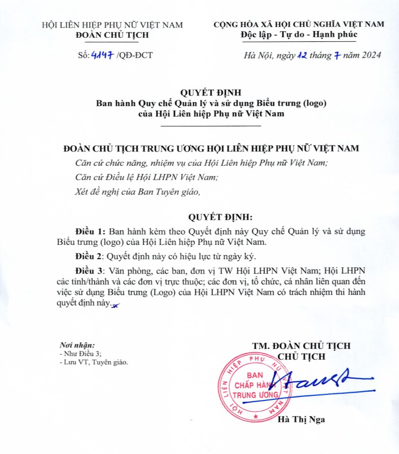 Quy chế Quản lý và sử dụng Biểu trưng (logo) của Hội LHPN Việt Nam 19/07/2024 Theo Quyết định số 4147/QĐ-ĐCT ngày 12/7/2024. Tải toàn văn Quyết định TẠI ĐÂY