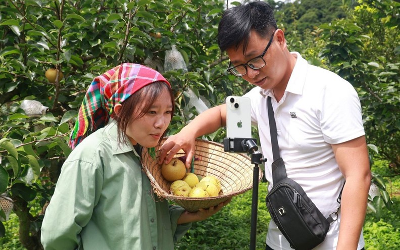 Chị Lò Thị Thuông, Chủ nhiệm Tổ hợp tác khoai sọ xã Mường Luân (tỉnh Điện Biên), “lên sóng” giới thiệu nông sản
