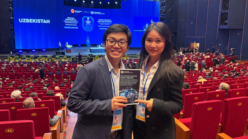Hai thành viên Ban Tham vấn Thanh niên Plan International Việt Nam Trần Hà Anh và Phan An Khang tại Lễ mở ký Công ước Hà Nội với vai trò quan sát viên. (Ảnh Plan International Việt Nam) Ngày 26/10, nhân dịp Lễ mở ký Công ước của Liên hợp quốc về chống tội phạm mạng (Công ước Hà Nội) tại Hà Nội, tổ chức Plan International Việt Nam tiếp tục khẳng định cam kết lâu dài trong công tác bảo vệ trẻ em trên môi trường mạng, thông qua hàng loạt hoạt động phối hợp, nâng cao nhận thức và thúc đẩy tiếng nói của thanh thiếu niên.
