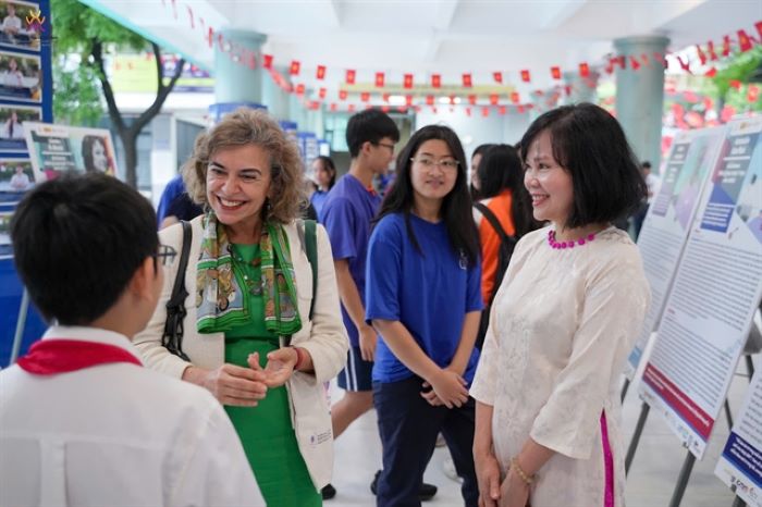 At Trưng Vương on September 22, students had the chance to meet Dr Nguyễn Thị Phương Thảo, the only Vietnamese scientist selected as a Young Affiliate (2024–2029) of the World Academy of Sciences, who encouraged them with the message that science has no limits if one has passion and determination.