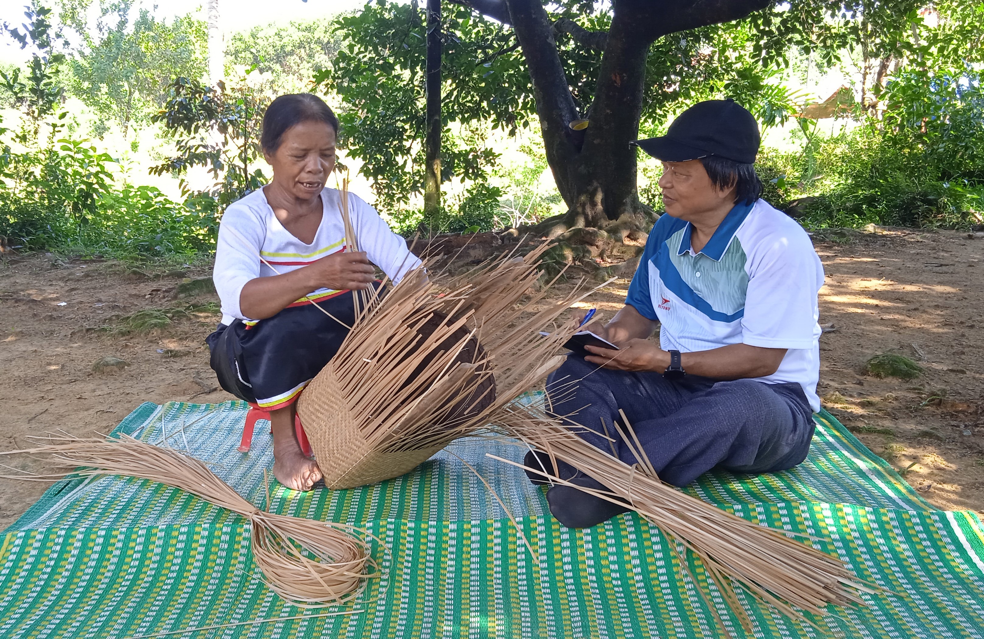 Bà Thủy chia sẻ những khó khăn trong nghề đan lát của người Cor với tác giả (bên phải)