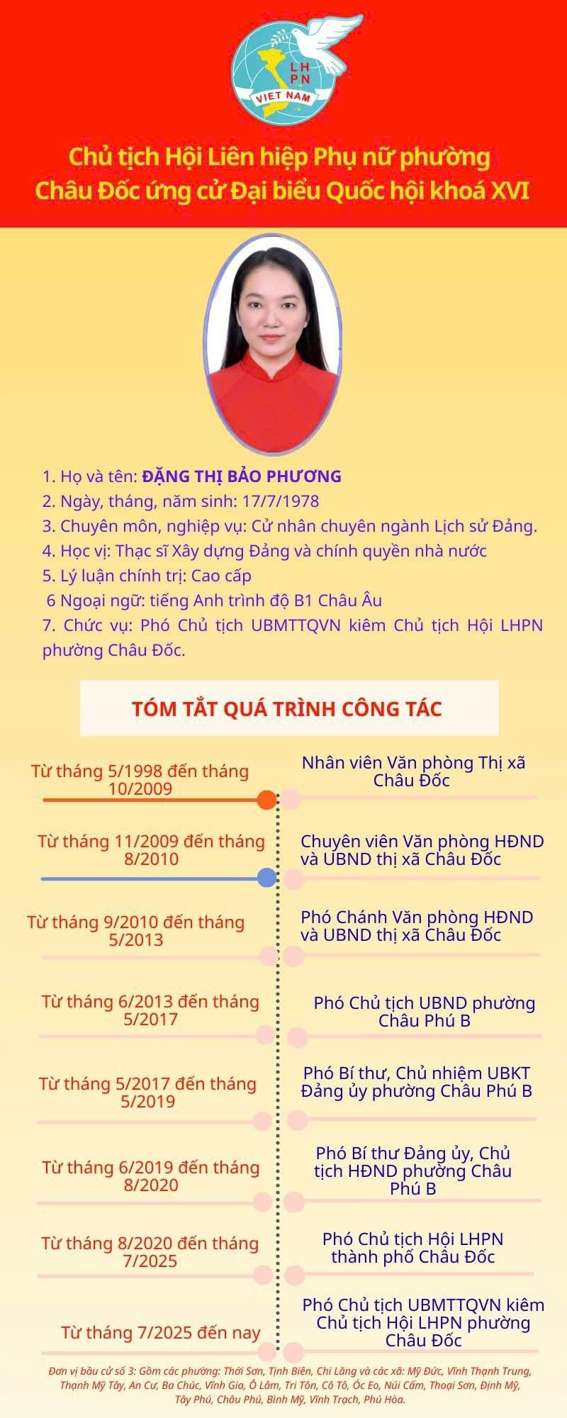 Bà Đặng Thị Bảo Phương được Hội đồng bầu cử Quốc gia phân bổ ứng cử Đại biểu Quốc hội khóa XVI tại Đơn vị bầu cử số 3, tỉnh An Giang.