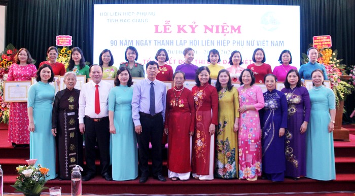 Các đồng chí lãnh đạo tỉnh Bắc Giang chụp ảnh lưu niệm với Hội LHPN tỉnh Bắc Giang tại lễ kỷ niệm Đến dự có các đồng chí: Bùi Văn Hải, Ủy viên Ban Chấp hành T.Ư Đảng, Bí thư Tỉnh ủy; Lâm Thị Hương Thành, Ủy viên BTV Tỉnh ủy, Phó Chủ tịch HĐND tỉnh; Trần Công Thắng, Ủy viên BTV Tỉnh ủy, Chủ tịch Ủy ban MTTQ tỉnh; Lê Ánh Dương, Phó Chủ tịch Thường trực UBND tỉnh, Trưởng Ban Vì sự tiến bộ của phụ nữ tỉnh cùng lãnh đạo các sở, ban, ngành, đoàn thể tỉnh; đại diện các thế hệ lãnh đạo, cán bộ Hội LHPN tỉnh, lãnh đạo Hội LHPN các huyện, thành phố.