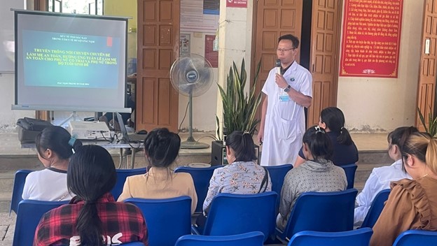 Cán bộ Trung tâm Y tế huyện Pác Nặm đang chia sẻ kiến thức về làm mẹ an toàn cho những phụ nữ đang mang thai, nuôi con nhỏ tại Trạm Y tế xã Giáo Hiệu, huyện Pác Nặm, tỉnh Bắc Kạn