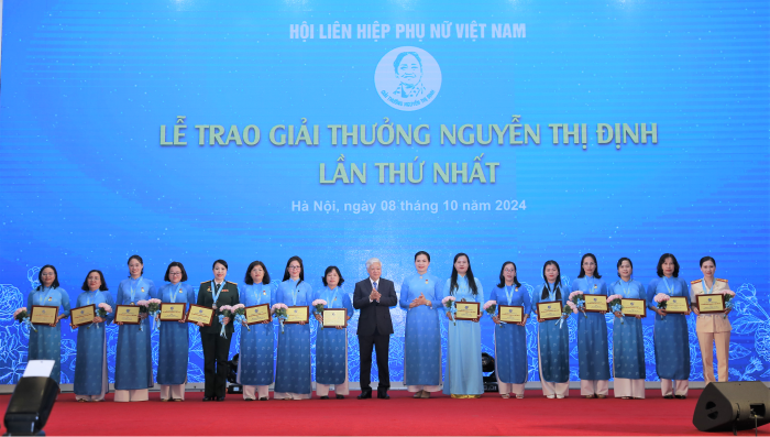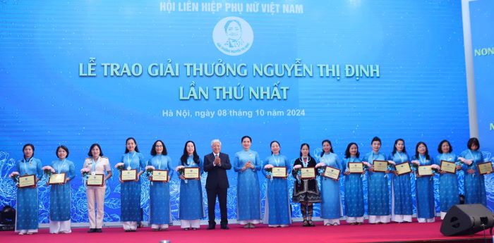 Ủy viên Bộ Chính trị, Bí thư TW Đảng, Chủ tịch Ủy ban Trung ương Mặt Trận Tổ quốc Việt Nam Đỗ Văn Chiến và Uỷ viên TW Đảng, Chủ tịch Hội LHPN Việt Nam Hà Thị Nga trao giải thưởng Nguyễn Thị Định cho các cán bộ Hôi Giải thưởng Nguyễn Thị Định là phần thưởng cao quý của Ban Chấp hành Trung ương Hội LHPN Việt Nam dành tặng cán bộ Hội LHPN các cấp có thành tích đặc biệt xuất sắc, xét tặng 2 lần trong 1 nhiệm kỳ. Giải thưởng năm nay dự kiến sẽ được trao cho 30 cán bộ Hội, trong đó có 17 chị ở cấp tỉnh, 10 chị ở cấp huyện và 03 chị ở cấp cơ sở.