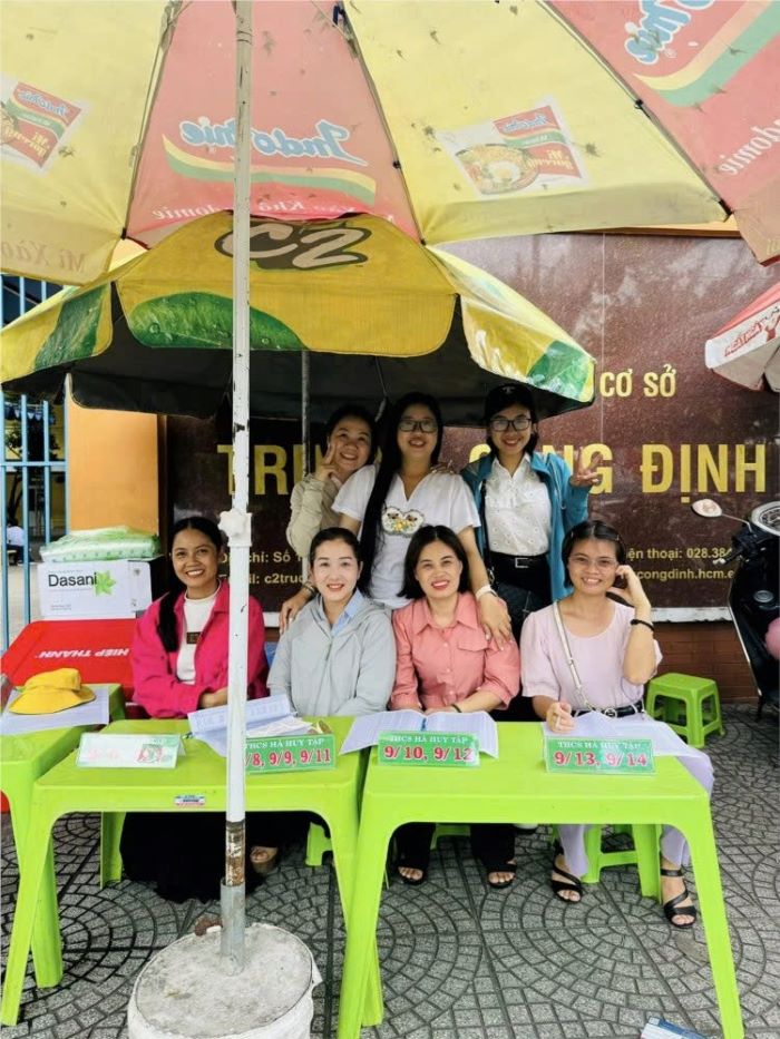 Cô Diễm Trâm cùng các cô tiếp nước, bánh, sữa hỗ trợ cho các em học sinh thi tốt nghiệp lớp 9