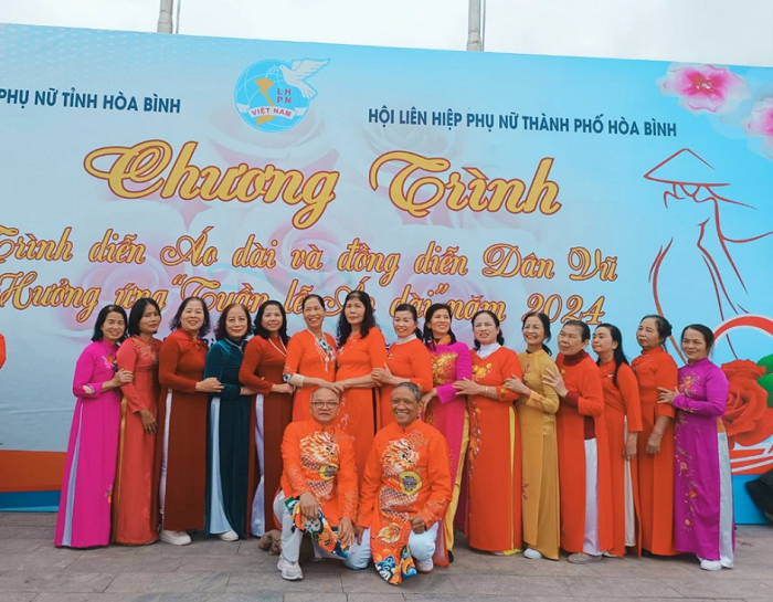 Trong khuôn khổ chương trình, cán bộ, hội viên phụ nữ đã tham gia đồng diễn các bài dân vũ và diễu hành áo dài hưởng ứng tại khu vực quảng trường và một số tuyến đường trên địa bàn thành phố Hòa Bình. Đặc biệt, các tiết mục này còn có sự tham dự của những hội viên danh dự là nam giới. Trong đó có ông Nguyễn Vũ Thái (68 tuổi, trú tại phường Thịnh Lang, thành phố Hòa Bình).