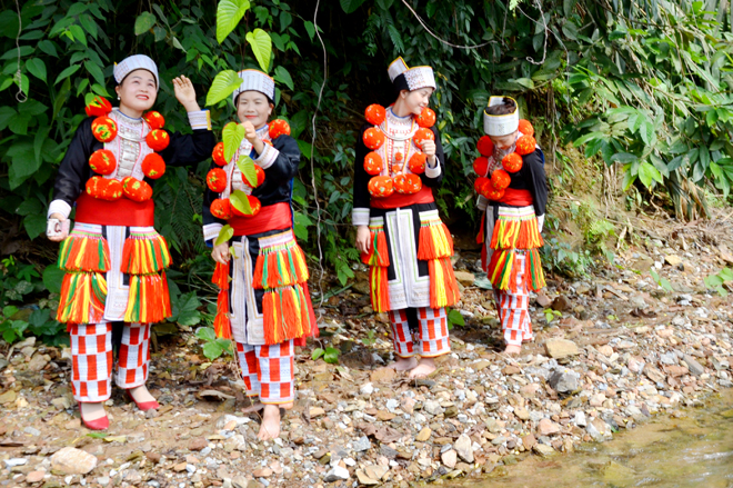 Để giữ gìn nét đẹp truyền thống trong trang phục dân tộc mình, sau những giờ làm việc đồng áng, những người như em Bàn Thị Phương, Phùng Thị Choáng, Bàn Thị Hiền lại cùng nhau trao đổi kinh nghiệm, nâng cao tay nghề may, thêu thổ cẩm truyền thống.