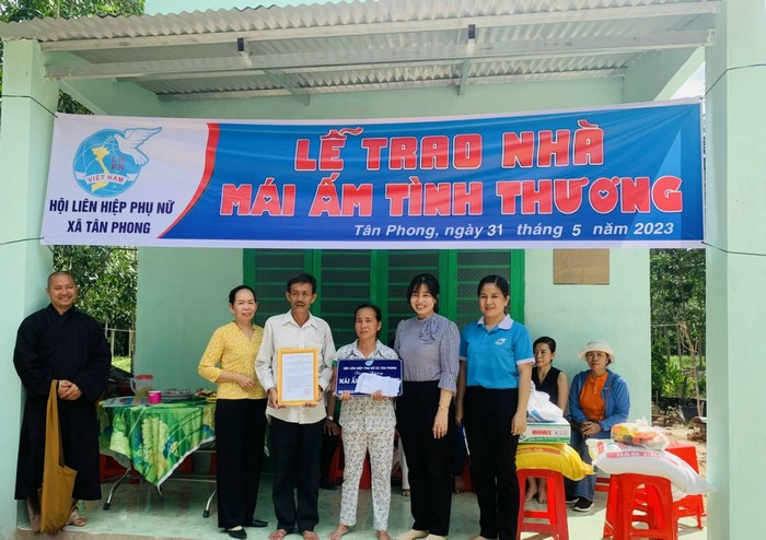 Chị Nguyễn Thị Diệu Thu (bìa phải) trao mái ấm tình thương cho chị Lâm Tiền